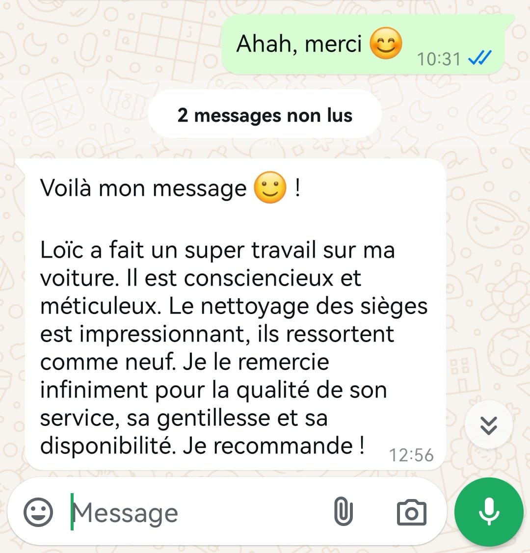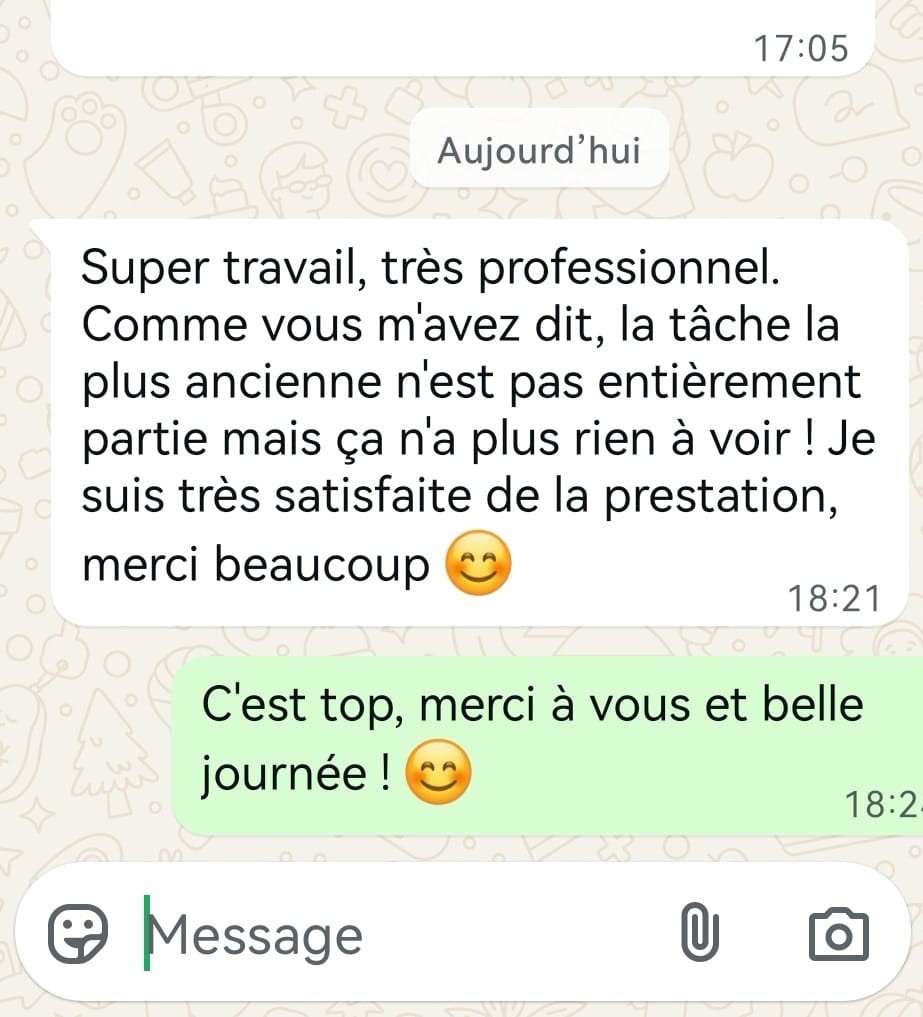 Certaines taches très anciennes ou dommages irréversibles peuvent ne pas disparaître totalement, malgré un nettoyage en profondeur. Ces limitations vous sont expliquées avec transparence avant la prestation.